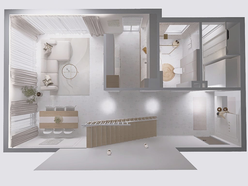 - jasna strefa dzienna z kuchnią, salonem i jadalnią,